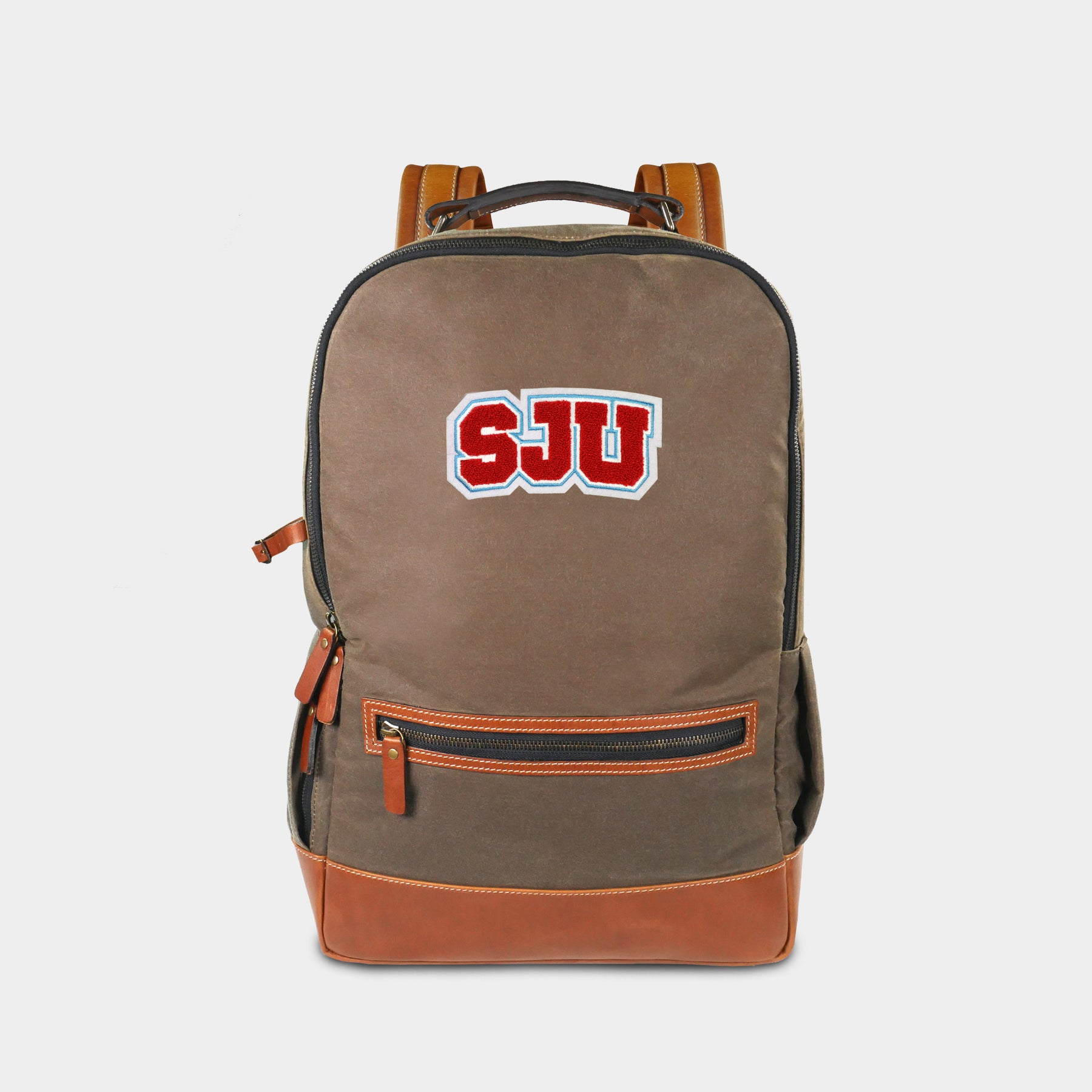 The Saint John's Johnnies Pro Waxed Canvas Backpack is likely the most stylish way to carry your items across campus or through the airport while showing your "SJU" pride. These beautiful and durable bags are made in the US with a water resistant canvas exterior, refined leather handles and accents and brass hardware and zippers. The perfect balance of form, and function; design and durability. To last a lifetime.
