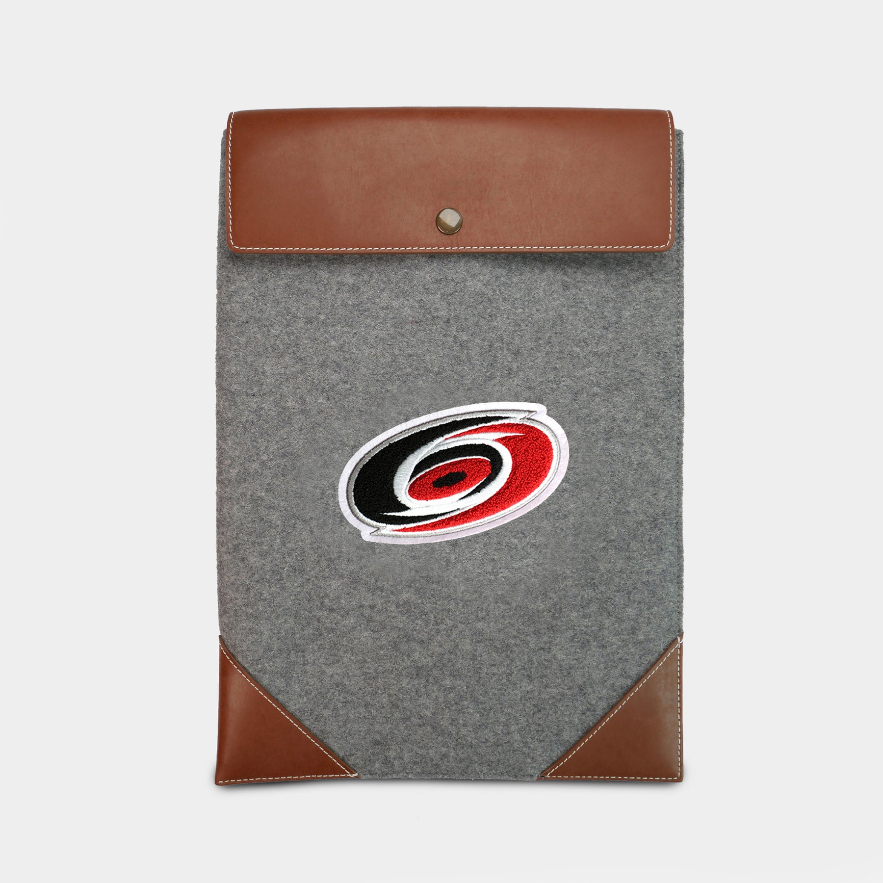 Brand new from Heritage Gear, our beautiful melton wool and leather trim Laptop and Documents Holder can serve either purpose depending on your need. Made of sustainable wool harvested with integrity and saddle leather trim on both the flap and corners, this piece is as sturdy as it is beautiful. The leather flap has a brass snap closure and is padded and lined in a sturdy color coordinated cotton twill to protect your laptop or any items inside. And with the Carolina Hurricanes vintage chenille patch hand sewn to the cover, you can display your Carolina Hurricanes pride with class. Sized to fit any laptop and to fit comfortably inside a backpack, duffel bag or piece of luggage, the Laptop and Document Holder from Heritage Gear will go wherever you go in style and will likely last you through multiple laptop purchases.