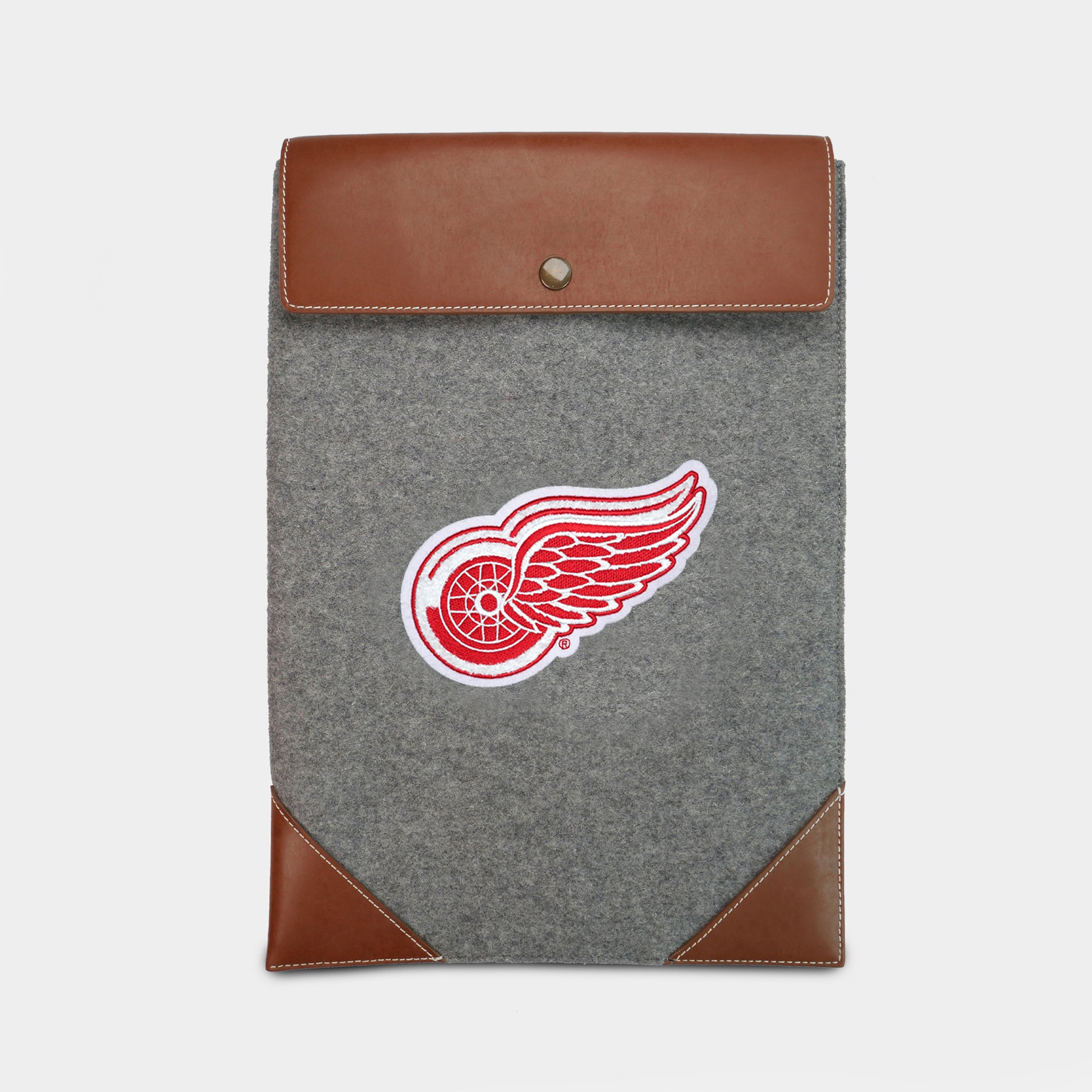 Brand new from Heritage Gear, our beautiful melton wool and leather trim Laptop and Documents Holder can serve either purpose depending on your need. Made of sustainable wool harvested with integrity and saddle leather trim on both the flap and corners, this piece is as sturdy as it is beautiful. The leather flap has a brass snap closure and is padded and lined in a sturdy color coordinated cotton twill to protect your laptop or any items inside. And with the Detroit Red Wings vintage chenille patch hand sewn to the cover, you can display your Detroit Red Wings pride with class. Sized to fit any laptop and to fit comfortably inside a backpack, duffel bag or piece of luggage, the Laptop and Document Holder from Heritage Gear will go wherever you go in style and will likely last you through multiple laptop purchases.