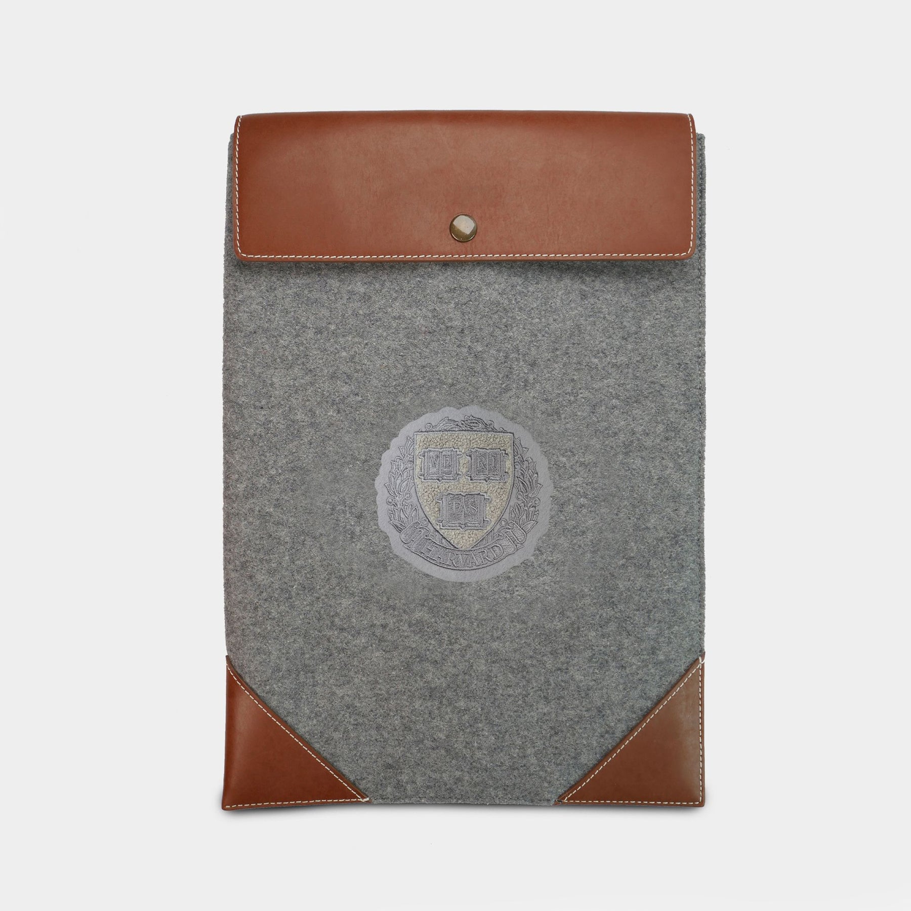 Brand new from Heritage Gear, our beautiful melton wool and leather trim Laptop & Documents Holder can serve either purpose depending on your need. Made of sustainable wool harvested with integrity and saddle leather trim on both the flap and corners, this piece is as sturdy as it is beautiful. The leather flap has a brass snap closure and is padded and lined in a sturdy color coordinated cotton twill to protect your laptop or any items inside. And with the Harvard Tonal classic chenille patch hand sewn to the cover, you can display your Harvard pride with class. Sized to fit any laptop and to fit comfortably inside a backpack, duffel bag or piece of luggage, the Laptop & Document Holder from Heritage Gear will go wherever you go in style and will likely last you through multiple laptop purchases.