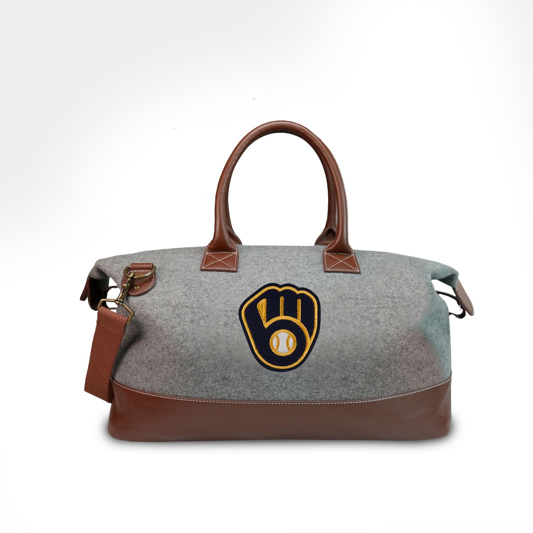 “Here we go Brew Crew” with the beautiful new Milwaukee Brewers “Mitt” logo Weekender from Heritage Gear. The team that made Milwaukee famous with greats like Aaron, Yount and Molitor and “Harvey’s Wallbangers” have a bag as cool as their uniforms. The Milwaukee Brewers “Mitt” logo Weekender is made of sustainable melton wool from one of the oldest mills in the USA and features the MB “Mitt” in blue and gold chenille handsewn on navy wool. Crafted to last a lifetime, the Brewers “Mitt” Weekender has full-grain leather, double lock stitching, solid zippers and metals. It’s perfect for travel, spontaneous weekend adventures, and as a gift for the die-hard Milwaukee baseball fan in your life. This bag features a zippered interior pocket, twill cotton lining throughout, and only gets better with time.