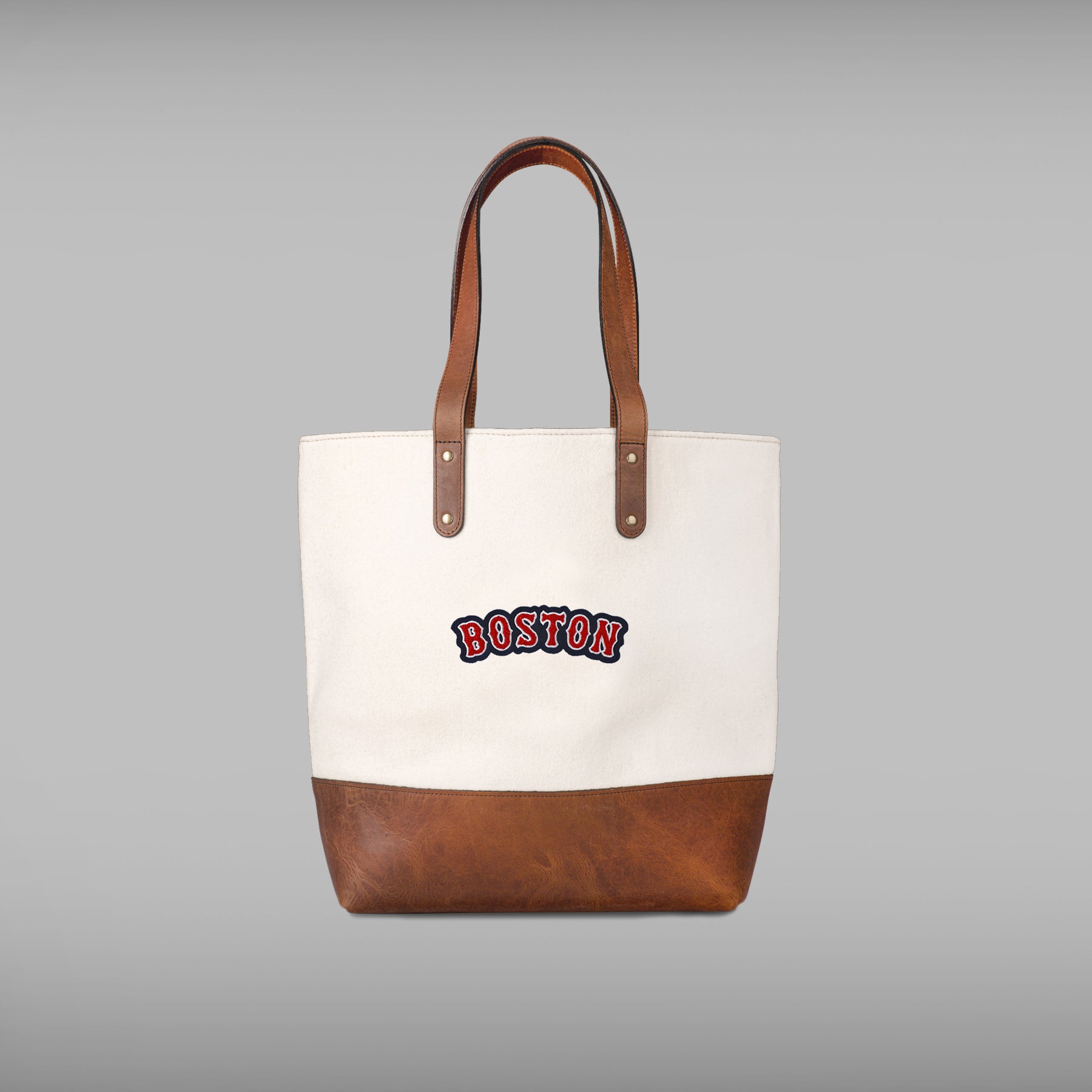The Boston Red Sox "Boston" Cream Tote with the iconic logo is made with sustainable, premium melton wool. The classic "Boston" logo silhouette has been crafted on a high-quality chenille patch and handsewn to the bag. From the full grain tan leather, to double lock stitching, with solid zippers and metals, the Boston Red Sox Tote by Heritage Gear will only get better with time. This open-top, unfastened woolen tote bag features a zippered interior pocket, twill cotton lining throughout.