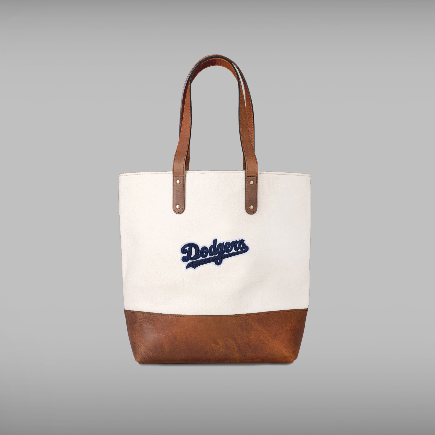 The Los Angeles Dodgers Script Cream Tote with the iconic logo is made with sustainable, premium melton wool. The classic Dodgers logo silhouette has been crafted on a high-quality chenille patch and handsewn to the bag. From the full grain tan leather, to double lock stitching, with solid zippers and metals, the Los Angeles Dodgers Tote by Heritage Gear will only get better with time. This open-top, unfastened woolen tote bag features a zippered interior pocket, twill cotton lining throughout.