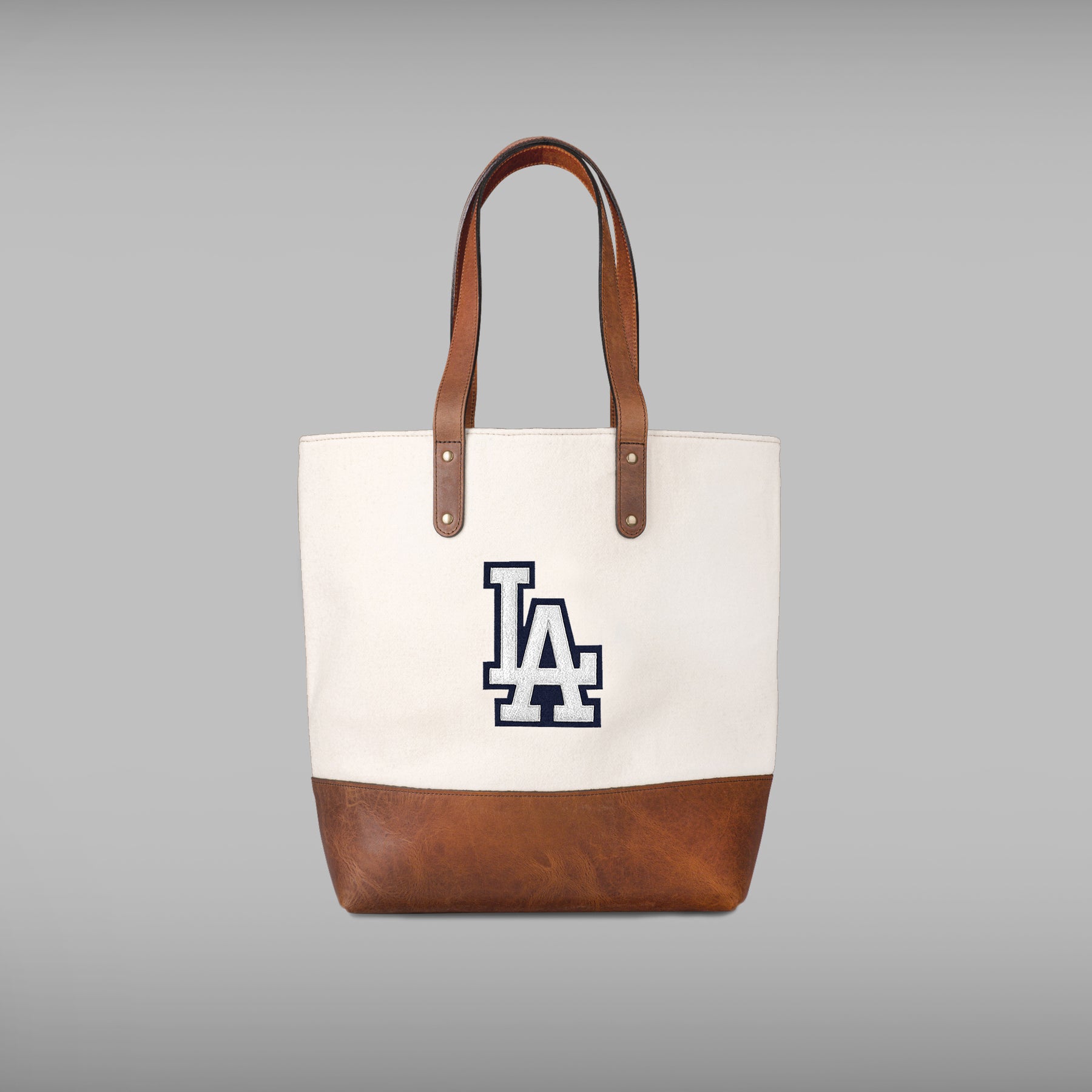 The Los Angeles Dodgers White LA Cream Tote with the iconic logo is made with sustainable, premium melton wool. The classic White LA logo silhouette has been crafted on a high-quality chenille patch and handsewn to the bag. From the full grain tan leather, to double lock stitching, with solid zippers and metals, the Los Angeles Dodgers Tote by Heritage Gear will only get better with time. This open-top, unfastened woolen tote bag features a zippered interior pocket, twill cotton lining throughout.