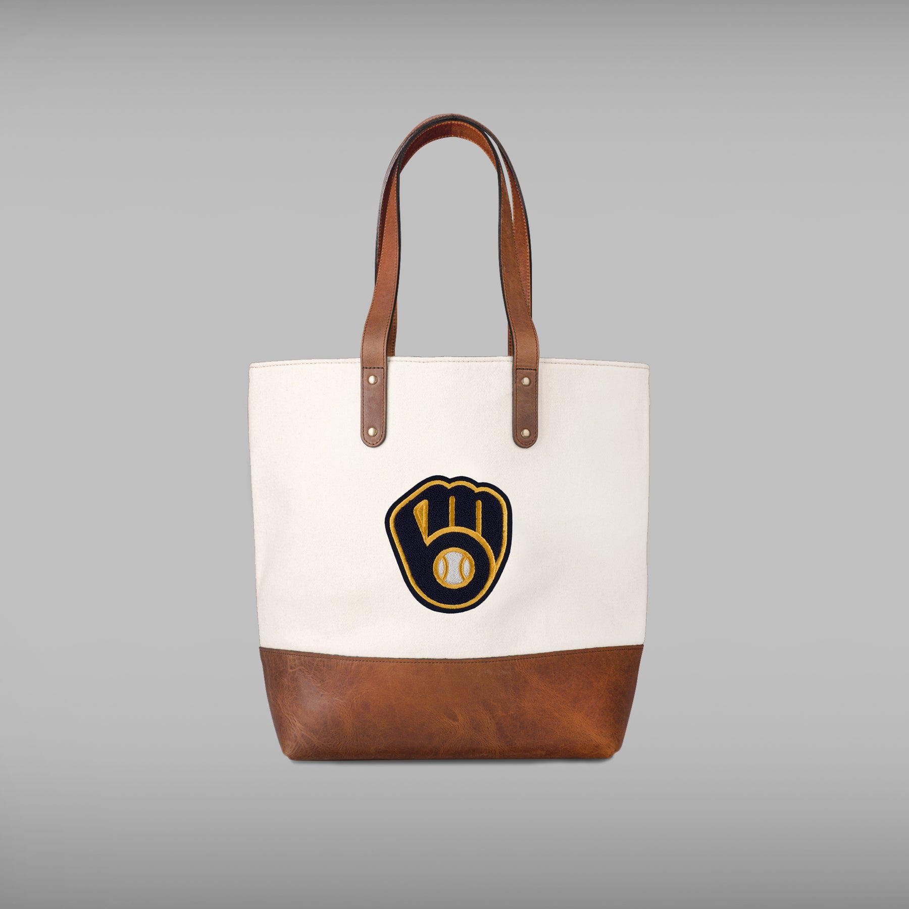 The Milwaukee Brewers Cream Tote with the iconic logo is made with sustainable, premium melton wool. The classic Milwaukee Brewers logo silhouette has been crafted on a high-quality chenille patch and handsewn to the bag. From the full grain tan leather, to double lock stitching, with solid zippers and metals, the Milwaukee Brewers Tote by Heritage Gear will only get better with time. This open-top, unfastened woolen tote bag features a zippered interior pocket, twill cotton lining throughout.