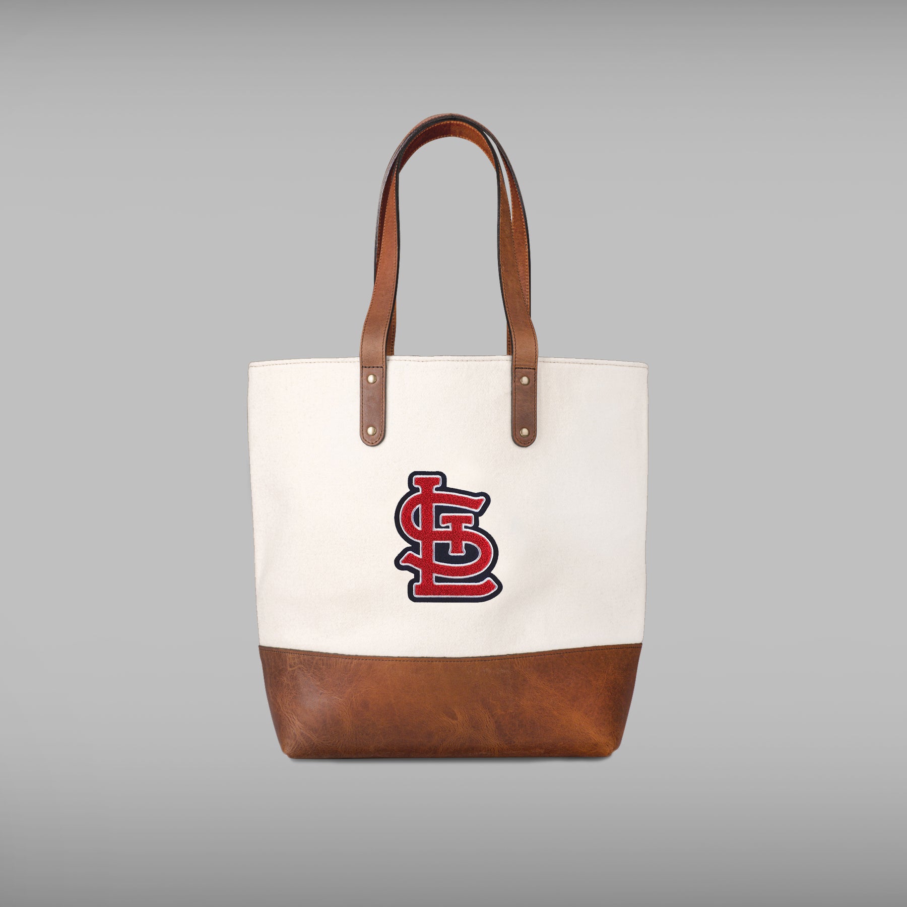 The St. Louis Cardinals "STL" Cream Tote with the iconic logo is made with sustainable, premium melton wool. The classic St. Louis "STL" logo silhouette has been crafted on a high-quality chenille patch and handsewn to the bag. From the full grain tan leather, to double lock stitching, with solid zippers and metals, the St. Louis Cardinals Tote by Heritage Gear will only get better with time. This open-top, unfastened woolen tote bag features a zippered interior pocket, twill cotton lining throughout.
