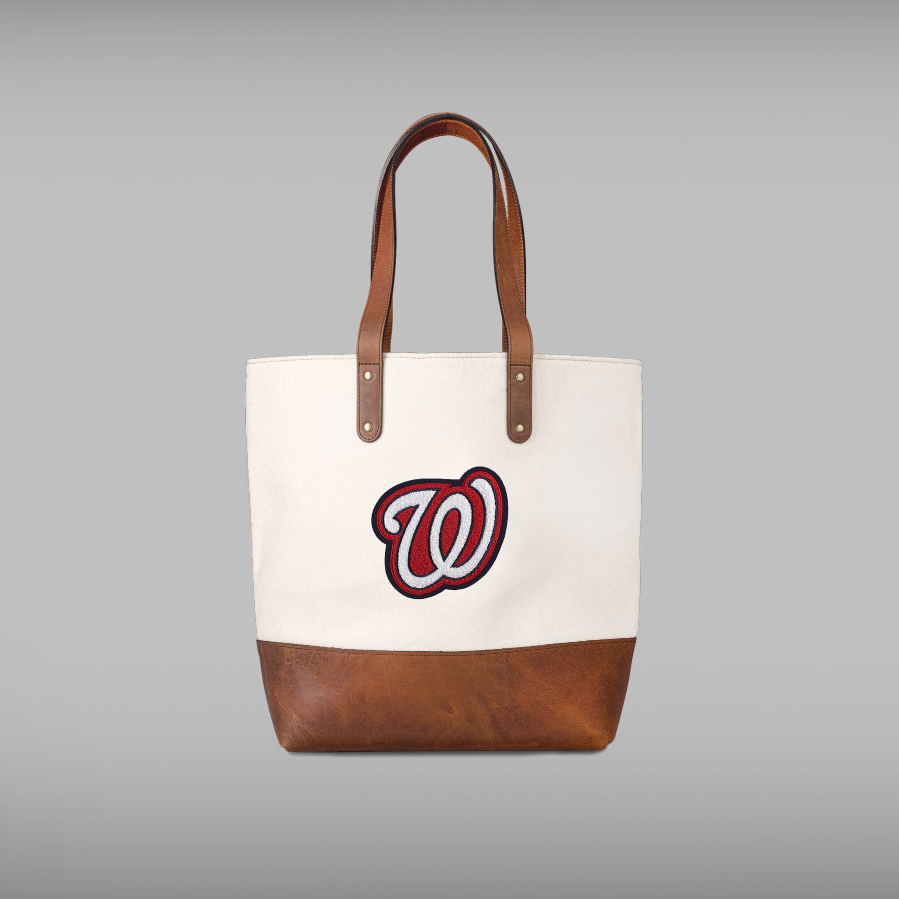 The Washington Nationals Cream Tote with the iconic logo is made with sustainable, premium melton wool. The classic Washington W logo silhouette has been crafted on a high-quality chenille patch and handsewn to the bag. From the full grain tan leather, to double lock stitching, with solid zippers and metals, the Washington Nationals Tote by Heritage Gear will only get better with time. This open-top, unfastened woolen tote bag features a zippered interior pocket, twill cotton lining throughout.