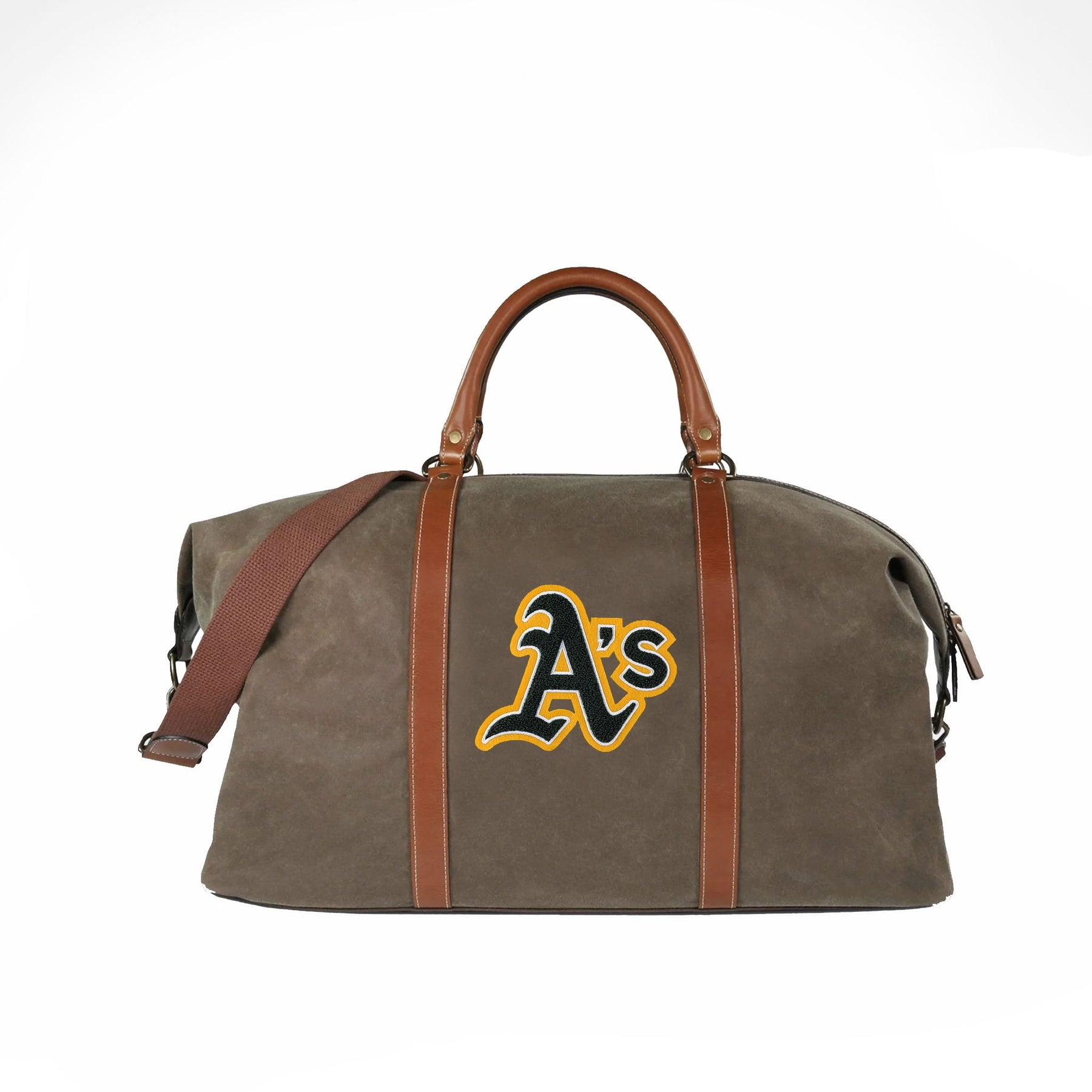 The Heritage Gear Pro Model Waxed Canvas Weekender Bag is handcrafted premium waxed canvas and can be used for anything from luxury travel to a simple weekend jaunt.  Designed to fit easily in an overhead compartment of a plane or the backseat of your car, this classic bag also features a leather shoulder strap, full grain leather trim and antiqued, solid brass hardware.  Top of the line in its class, the Heritage Gear Pro Model Weekender Bag also features a hand sewn chenille patch of your favorite collegiate or pro team or national flag. Built to last. A legacy piece to pass down to the next generation.