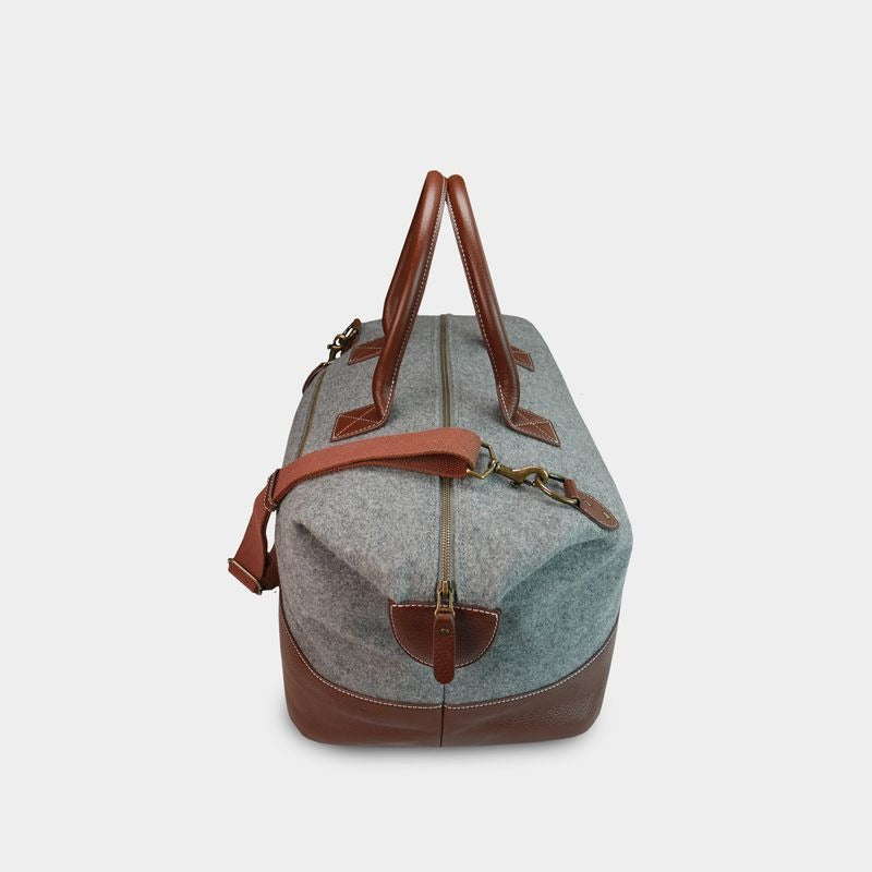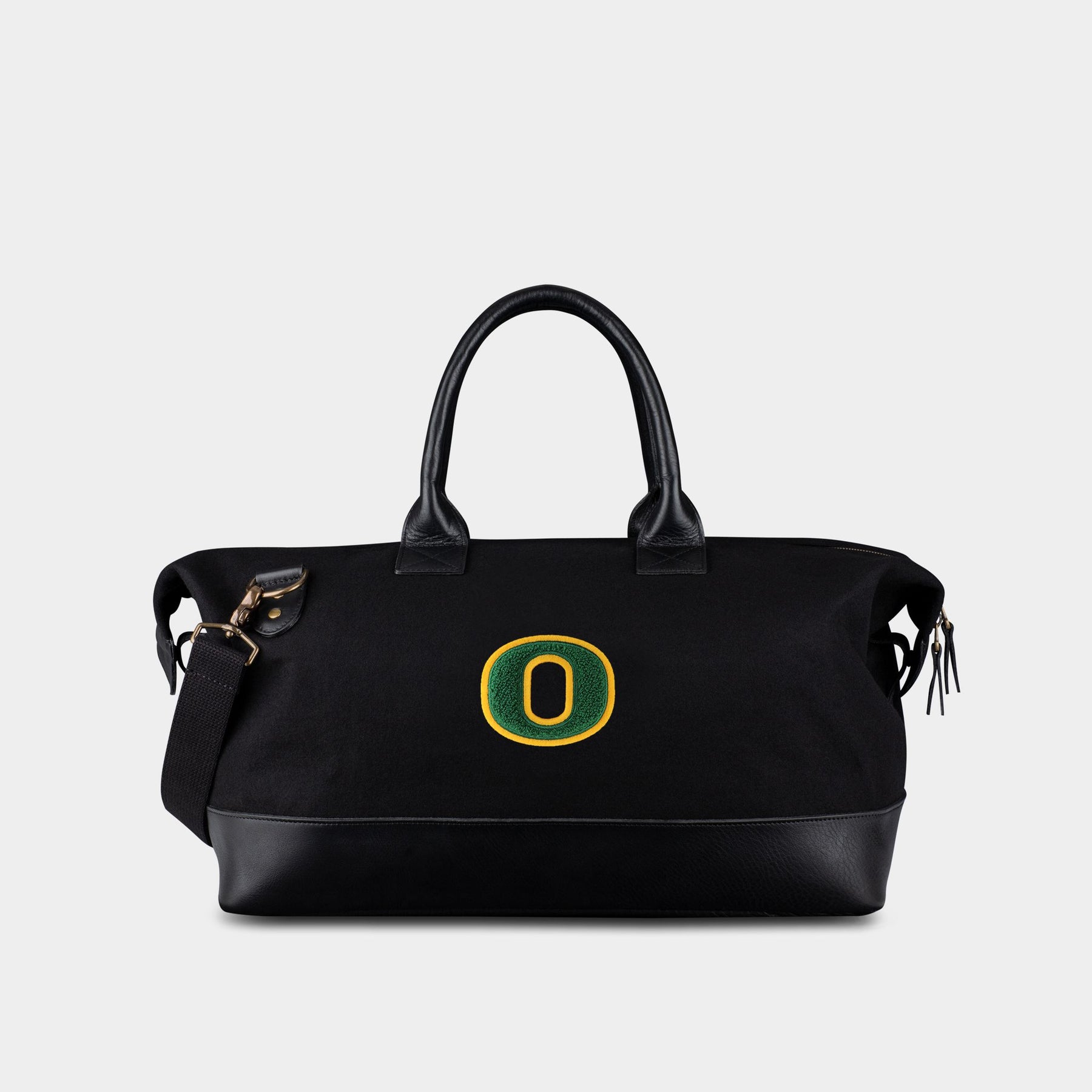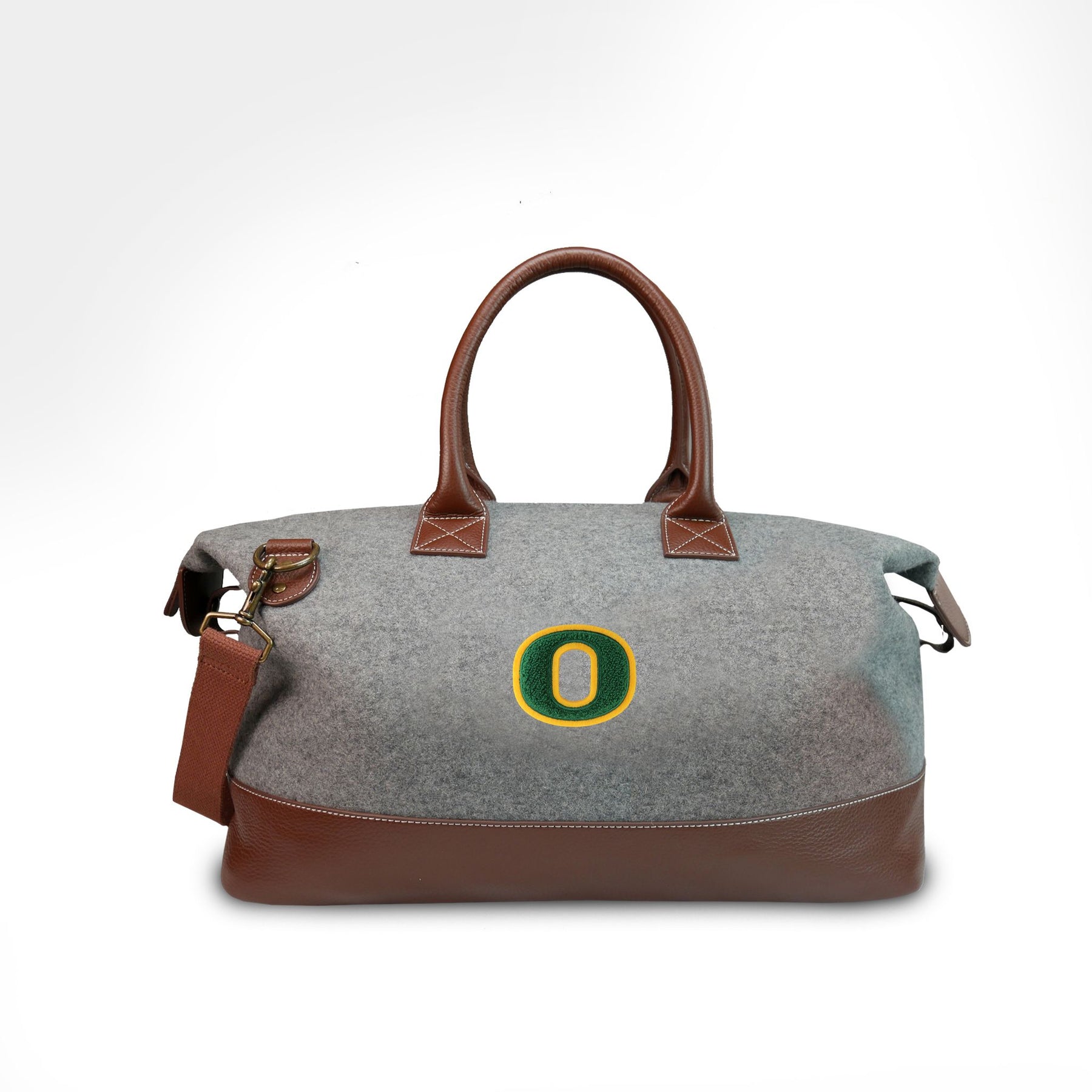 The Oregon Ducks "O" Weekender features sustainable melton wool from one of the oldest mills in the country and a high-quality chenille patch on its side as worn by athletes through the years. From the full grain leather, to double lock stitching, to solid zippers and metals and classic chenille patches, Heritage Gear bags truly get better with time. This bag features both an interior and exterior zippered pocket and twill cotton lining throughout.