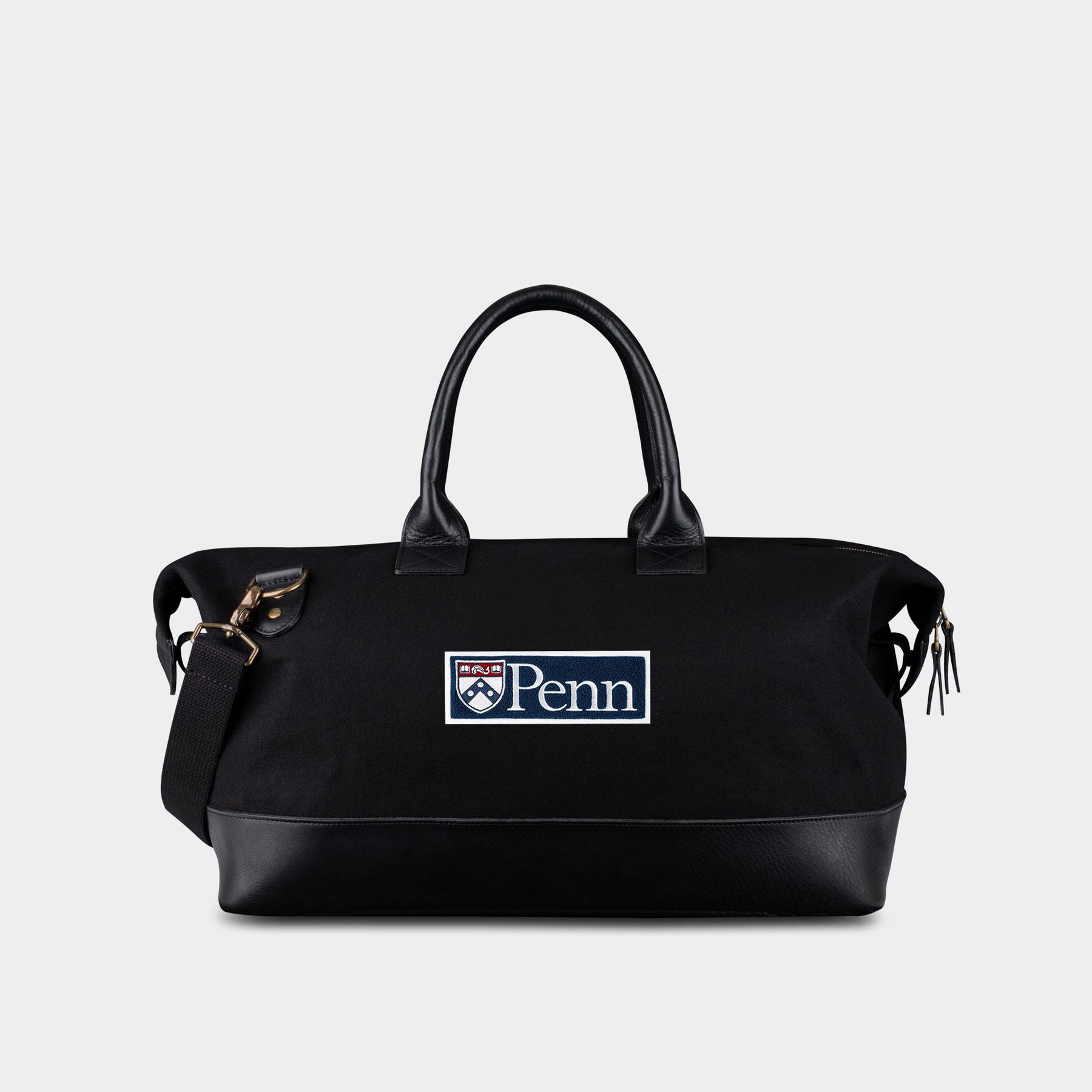 The University of Pennsylvania Navy Weekender with the distinctive Penn + Shield Logo in classic White & Navy, is made with sustainable melton wool from one of the oldest mills in the USA. The Penn Shield has been crafted on a high- quality chenille patch with Navy felt trim and handsewn to the bag. From the full grain tan leather, to double lock stitching, with solid zippers and metals, The University of Pennsylvania by Heritage Gear will truly get better with time. This bag also features a zippered interior pocket and twill cotton lining throughout.