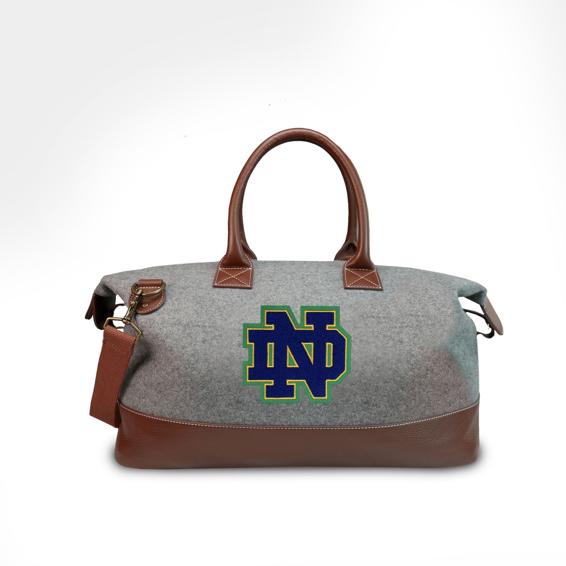 Celebrate one of the great teams in the history of college athletics with the Notre Dame Fighting Irish "ND Interlock" Weekender. This beautiful bag features sustainable melton wool from one of the oldest mills in the country and a high- quality handsewn chenille ND patch in Gold, symbolizing the famous golden dome at Notre Dame’s gorgeous campus. From the full-grain leather, to double lock stitching, the solid brass zippers and metals and classic chenille patches, Heritage Gear bags only get better with time. This bag features both an interior and exterior zippered pocket and twill cotton lining throughout. Go Irish!