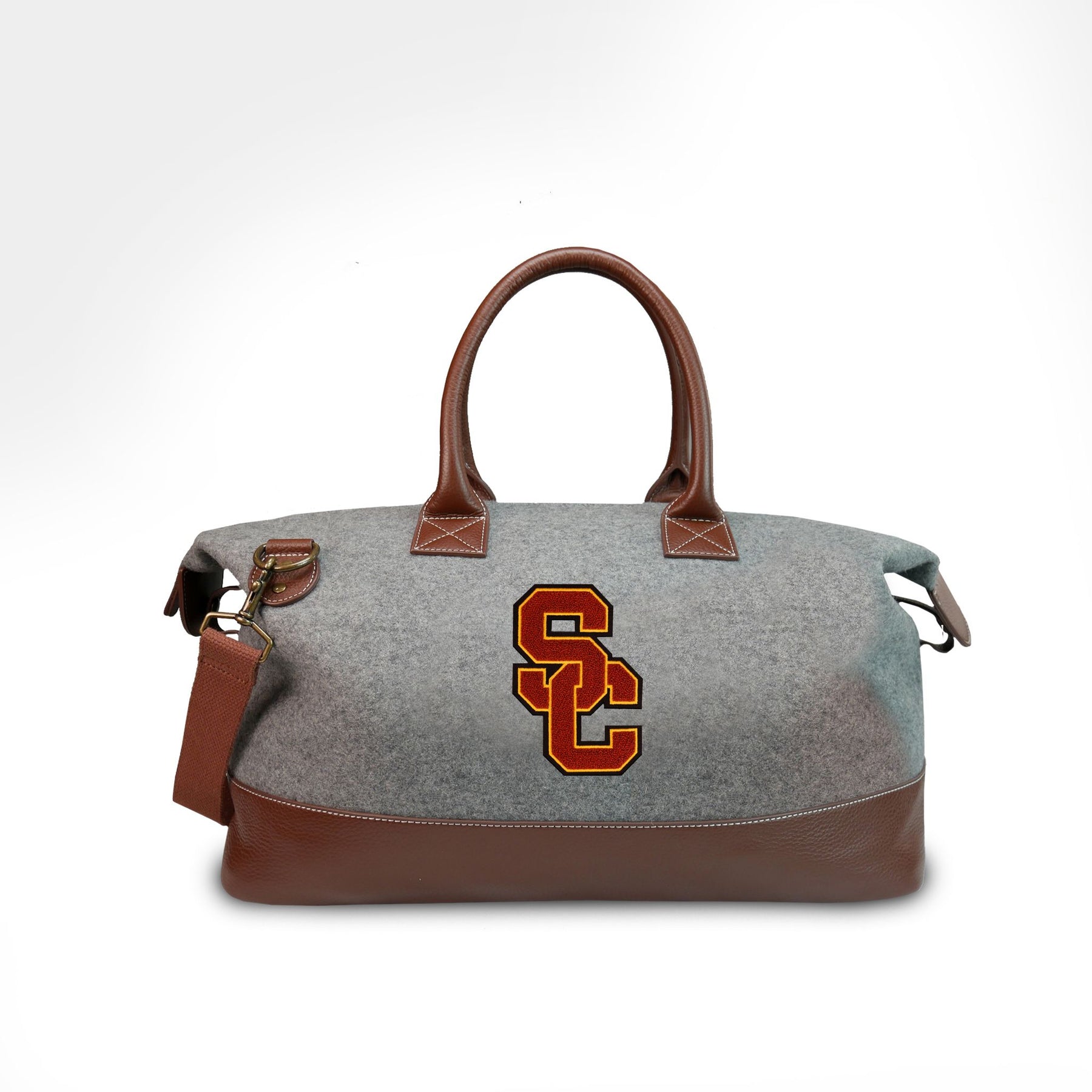 The USC Trojans "SC" Weekender features sustainable melton wool from one of the oldest mills in the country and a high-quality chenille patch on its side as worn by athletes throughout the years. From the full grain leather, to double lock stitching, to solid zippers and metals and classic chenille patches, Heritage Gear bags truly get better with time. This bag features both an interior and exterior zippered pocket and twill cotton lining throughout.